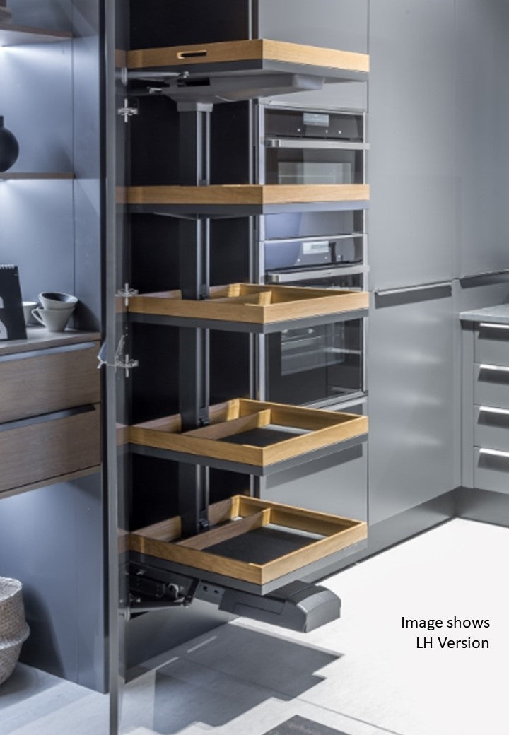 This Kesseböhmer Convoy Pull-Out Storage System in anthracite finish is designed for hinged doors in larder units, providing smooth full-extension access and a 130kg capacity. Featuring 5 anti-slip trays with double soft-close functionality, it combines durability, convenience, and a modern powder-coated finish.