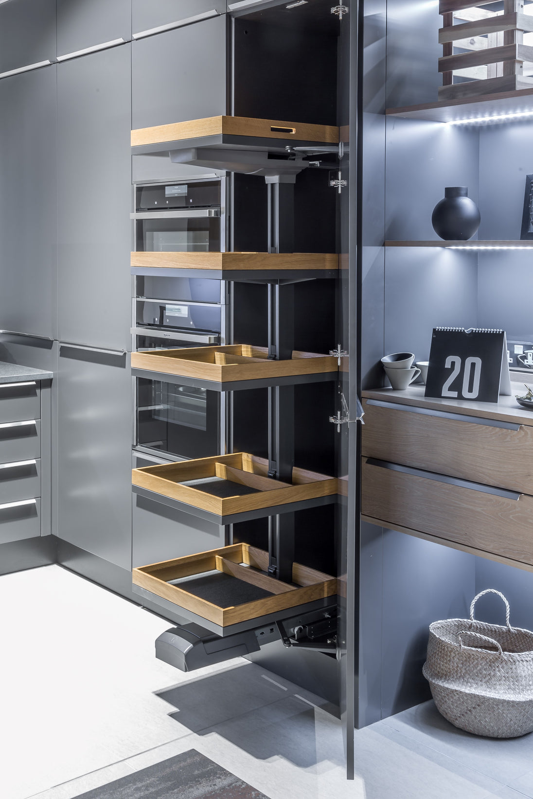 This Kesseböhmer Convoy Pull-Out Storage System in anthracite finish is designed for hinged doors in larder units, providing smooth full-extension access and a 130kg capacity. Featuring 5 anti-slip trays with double soft-close functionality, it combines durability, convenience, and a modern powder-coated finish.