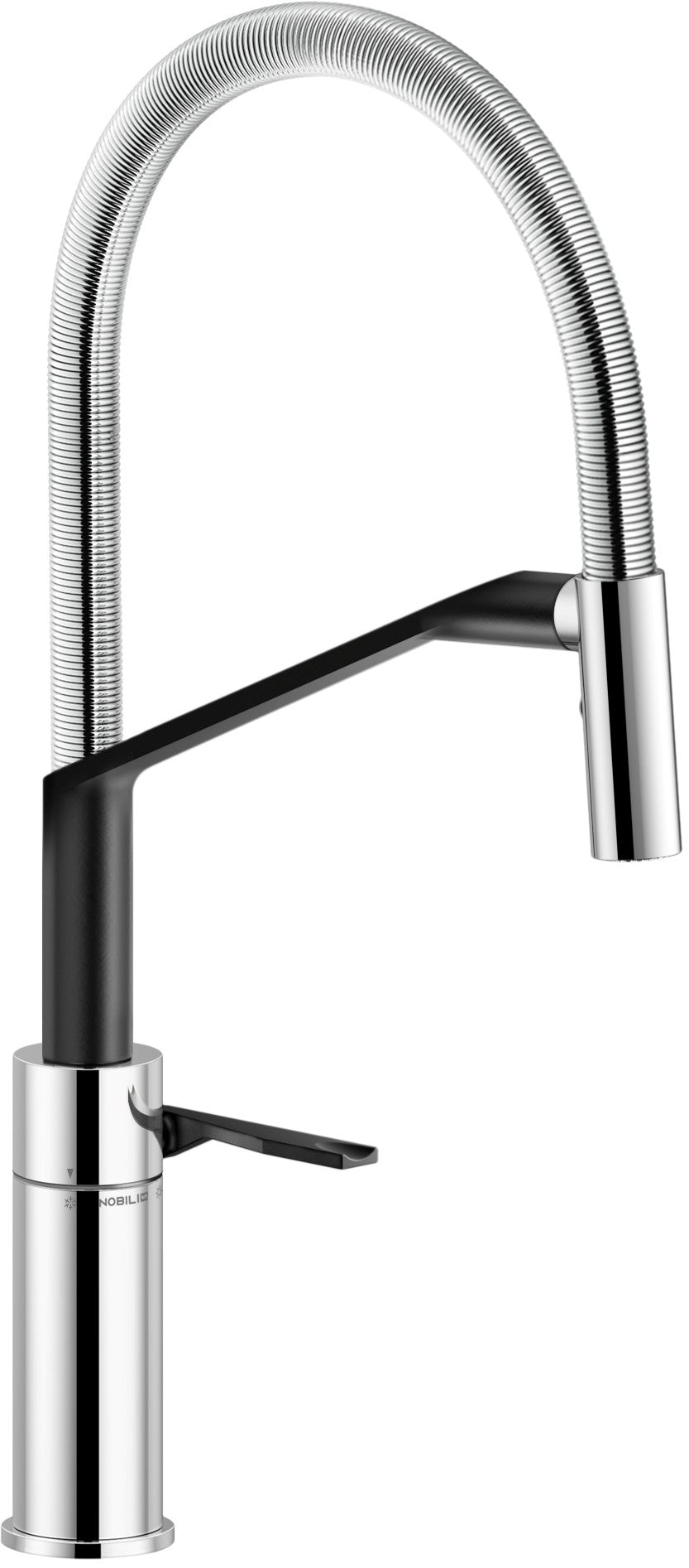 This Nobili Heron semi-professional tap in polished chrome and black combines stylish design with high performance. Suitable for kitchen use, it supports a pressure range of 0.5–10 Bar, offering both functionality and modern aesthetics.