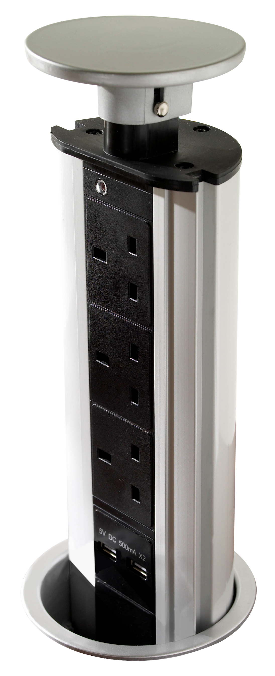 This Sycamore Pull-Up Socket in aluminium provides convenient retractable power access for kitchen worksurfaces. Its sleek aluminium finish combines modern design with practical functionality, keeping your workspace organized.